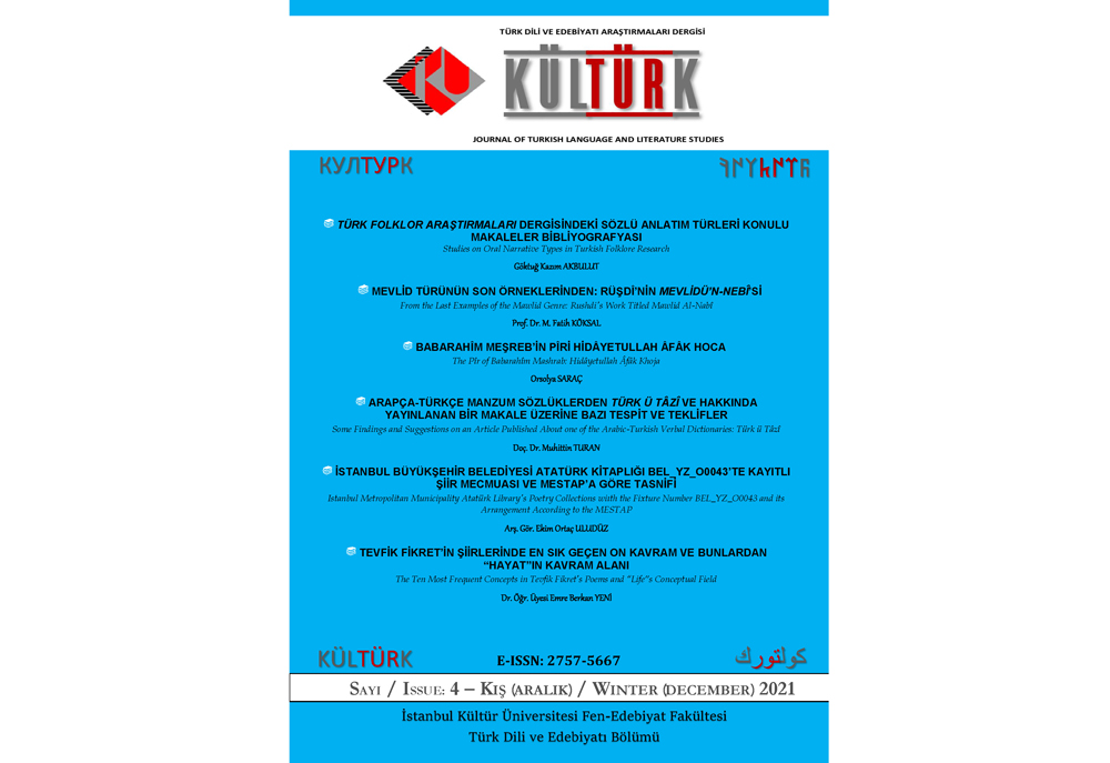 The 4th issue (WINTER 2021) of the "KÜLTÜRK" Turkish Language and Literature Researches Journal, published within the body of Istanbul Kültür University Faculty of Arts and Sciences Department of Turkish Language and Literature, was published on 27 December 2021.