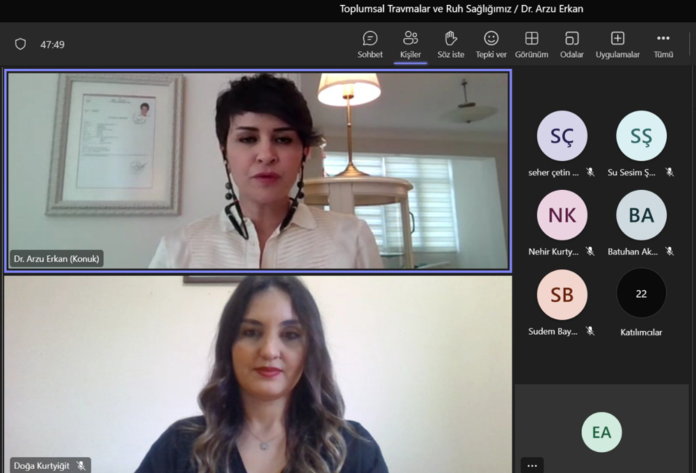 The first of the "Academy of Sustainable Life after Disaster", planned by the Student Life, Career and Alumni Counseling Unit (Kültür Point) with the theme of awareness and consciousness-raising for the disaster period and beyond was held on Tuesday, March 28, at 16.00, on Microsoft Teams with the title “Social Traumas and Our Mental Health.” Psychiatrist Dr. Arzu Erkan, who participated in the event as a speaker, gave information about what primary and secondary traumas experienced after a disaster are, how to cope and proper communication. Psychiatrist Dr. Arzu Erkan, who emphasized the importance of communication with the individuals affected by the disaster in particular, informed that these difficult periods will be overcome together. The seminar, which was also followed by participants from outside our university, ended after the questions were answered.