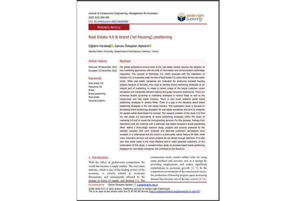 The article titled "Real Estate 4.0 and Brand (Residential) Positioning" co-written by Master Architect Çiğdem Karabağ, a postgraduate of the Department of Architecture, and Assist. Prof. Gamze Alptekin from the Department of Architecture, was published in the December 2022 issue of the Journal of Construction Engineering, Management & Innovation (JCEMI). In the article, in which the concept of Real Estate 4.0 is explained and brand positioning in the real estate sector was discussed, including a two-stage content analysis of brand positioning peculiar to a company producing branded housing, it was revealed how the subject matter was perceived by the consumer through the survey conducted.