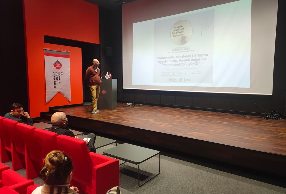 The Department of Business Administration held a seminar titled "Six Sigma Applications in Corporate Enterprises, Customer Value and Return on Investment" at the Basın Ekspres Campus Conference Hall on Wednesday, December 21. Lean Six Sigma Black Belt ING Bank Technology and Product Manager Mutlu Emir Bilişik, who attended the event as a speaker, informed the students of the Faculty of Economics and Administrative Sciences about lean six sigma practices and transformation studies in corporate businesses. Bilişik, who made evaluations on real sector case studies in his presentation, also talked about the utilized methods. At the end of the event, Head of Business Administration Assoc. Prof. Murat Taha Bilişik presented a gift to our guest.