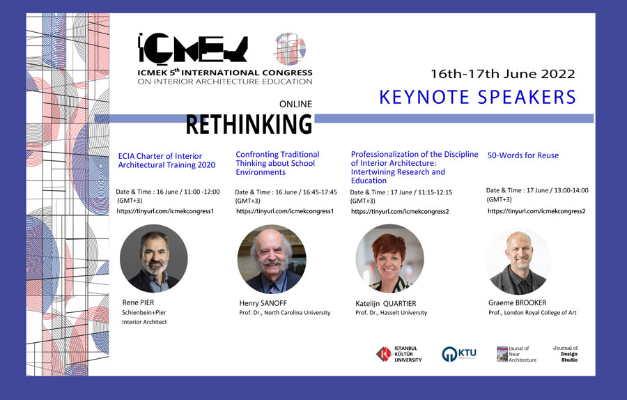 İstanbul Kültür Üniversitesi İç Mimarlık ve Çevre Tasarımı Bölümü ile Karadeniz Teknik Üniversitesi İç Mimarlık Bölümü işbirliğinde düzenlenen 5. İÇMEK ULUSLARARASI İÇ MİMARLIK EĞİTİMİ Kongresi, 16-17 Haziran 2022 tarihinde çevrim içi olarak gerçekleştirilecektir.