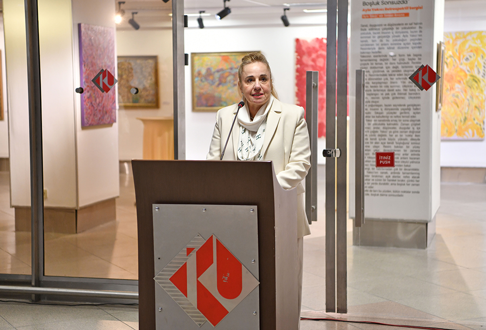 İstanbul Kültür Üniversitesi (İKÜ) Sanat Galerisi (İKÜSAG), geçtiğimiz yıllarda kaybettiğimiz sanatçı Ayla Yakıcı’nın "Bütün Noktalar Sonda, Boşluk Sonsuzda" adlı retrospektif sergisini 11 Şubat Çarşamba günü sanatseverlerle buluşturdu. Güzel Sanatlar Uygulama ve Araştırma Merkezi (GSUAM) tarafından düzenlenen serginin açılış konuşmalarını, Rektörümüz Prof. Dr. Fadime Üney Yüksektepe ve ressamın kardeşi Nermin İşçeviren yaptı." Bütün Noktalar Sonda, Boşluk Sonsuzda" başlıklı retrospektif sergi, Ayla Yakıcı’nın sanatını tamamlanmış bir anlatı olmaktan ziyade, süreklilik taşıyan düşünsel bir alan olarak ele alıyor. Belirgin bir figürün yer almadığı bu eserlerde, yoğun bir varlık duygusu hissediliyor. Renklerin birbirine karıştığı ve dokuların iç içe geçtiği soyut yapı; tek bir anlama işaret etmekten çok, izleyiciyi kişisel bir sezgi yolculuğuna davet ediyor. Sergi, 13 Mart 2026 tarihine kadar Bakırköy yerleşkesi Ataköy binasındaki İKÜ Sanat Galerisi’nde ziyaret edilebilecek.
