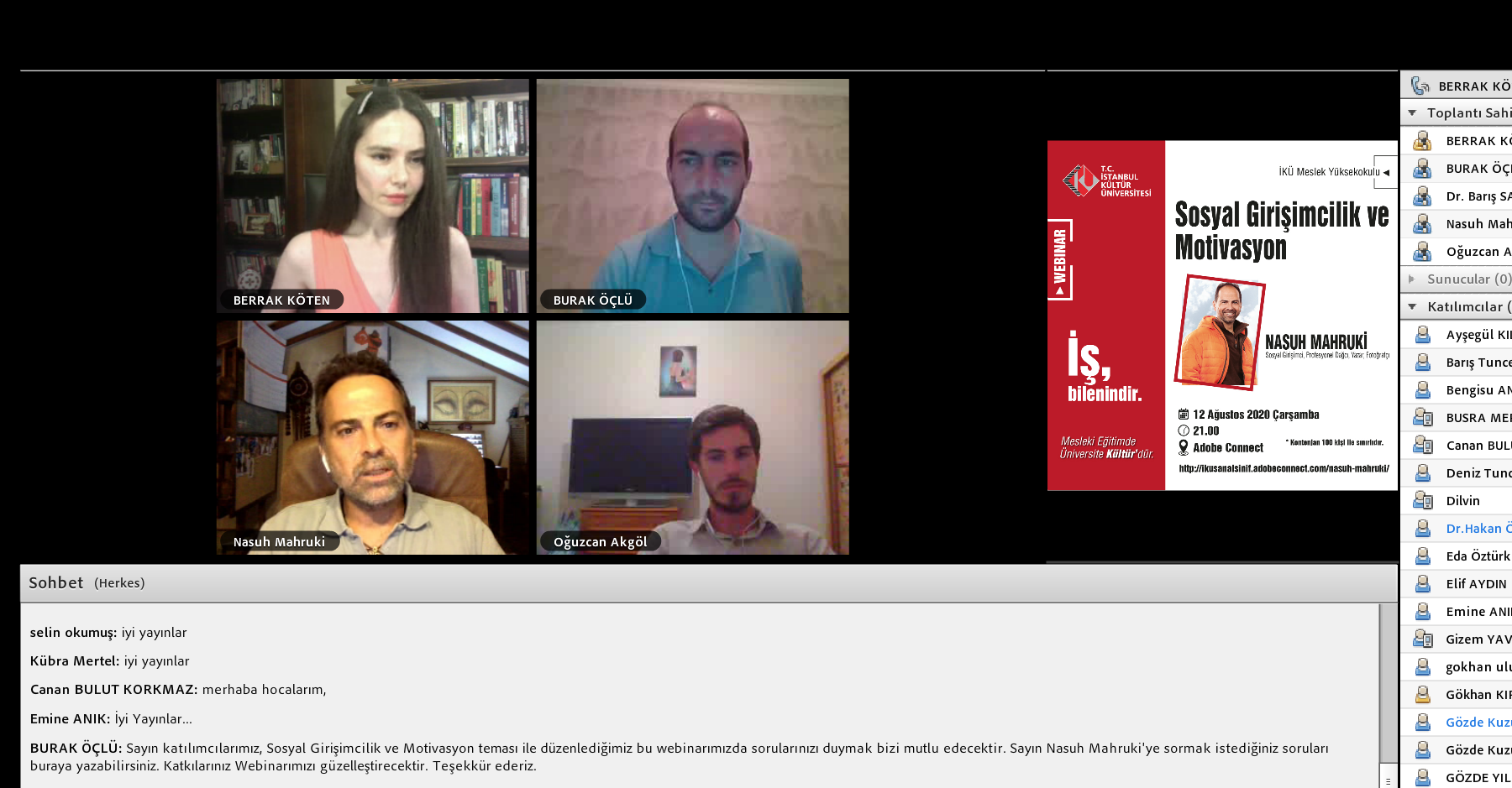İstanbul Kültür Üniversitesi Meslek Yüksekokulu tarafından organize edilen, moderatörlük görevlerini Öğr. Gör. Berrak Köten, Öğr. Gör. Dr. Barış Safran ve Öğr. Gör. Burak Öçlü’nün yaptığı “İş, Bilenindir. Girişimcilik Modelleri” webinar serisi, 12 Ağustos 2020 Çarşamba günü “Sosyal Girişimcilik ve Motivasyon” başlığında gerçekleştirilen söyleşi ile devam etti. Sosyal Girişimci, Profesyonel Dağcı, Fotoğrafçı ve Yazar Nasuh Mahruki’nin konuk olduğu webinarda katılımcıların sorularına da yanıt verildi.