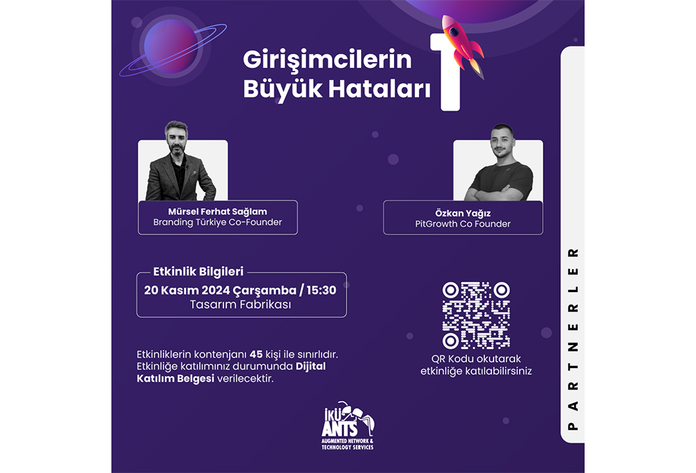 İKÜ Tasarım Fabrikası tarafından, "Girişimcilerin Büyük Hataları-1" başlıklı etkinlik düzenlenecek. PitGrowth Kurucusu Özkan Yağız ile Branding Türkiye Kurucusu Mürsel Ferhat Sağlam'ın konuşmacı olacakları etkinlik, 20 Kasım Salı günü saat 15.30’da Bakırköy yerleşkesi Ataköy binasındaki Tasarım Fabrikası'nda gerçekleştirilecek. 45 kişi ile sınırlı olan etkinliğe katılım sağlayacaklara, dijital katılımcı belgesi verilecek.