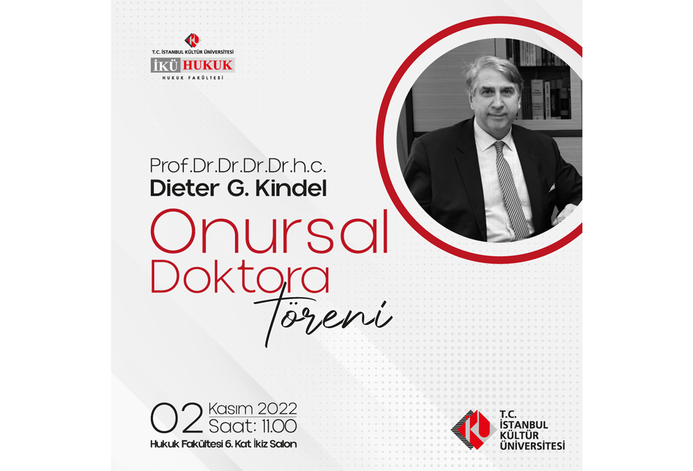 İKÜ Hukuk Fakültesi tarafından, 2 Kasım 2022 Çarşamba günü saat 11.00’de Hukuk Fakültesi 6. Kat İkiz Salon’da "Prof. Dr. Dr. Dr. Dr. h.c. Dieter G. Kindel’e Onursal Doktora Unvanı Takdim Töreni" düzenlenecek.