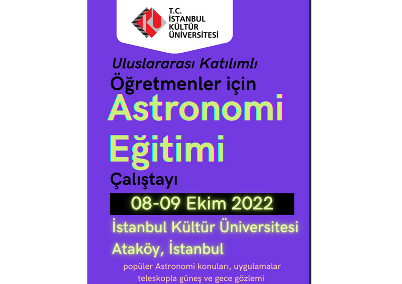 8-9 Ekim 2022 hafta sonu İstanbul Kültür Üniversitesi Ataköy Kampüsü’nde gerçekleşecek olan çalıştayımız ilköğretimde ilkokul ve ortaokul seviyesi öğretmenleri ve bu seviye öğrencilerle çalışan eğitimcileri hedef almaktadır. Eğitimcilerin müfredattaki Astronomi konularını öğrencilerine daha iyi aktarabilmeleri ve kendilerini geliştirmeleri için temel astronomi bilgilerinin uygulamalı olarak aktarılmasını amaçlıyoruz.