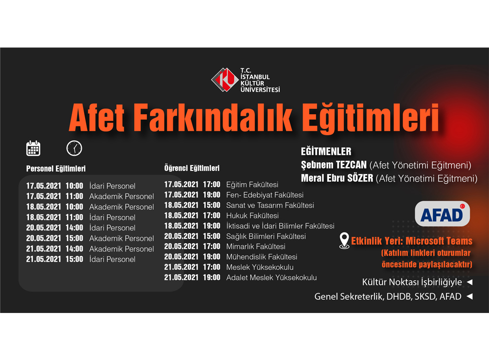 İstanbul Kültür Üniversitesi Genel Sekreterlik, Kültür Noktası, Destek Hizmetleri Daire Başkanlığı, Sağlık, Kültür ve Spor Daire Başkanlığı ile T.C. İçişleri Bakanlığı Afet ve Acil Durum Yönetimi Başkanlığı (AFAD) iş birliğinde, akademik-idari personel ile öğrencilerimize yönelik “Afet Farkındalık Eğitimleri” düzenlenecek. AFAD’dan Ebru Sözer ve Şebnem Tezcan tarafından verilecek eğitimler, 17-21 Mayıs tarihleri arasında gerçekleştirilecek.