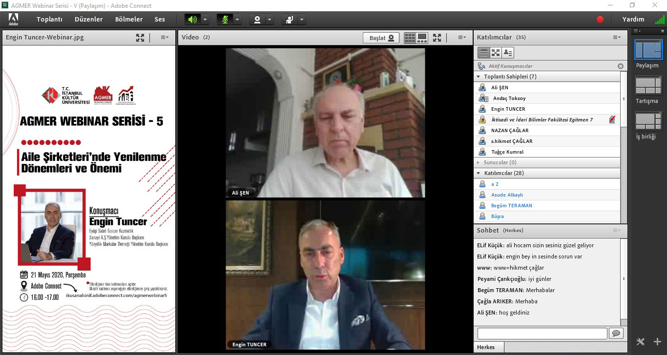 Aile İşletmeleri ve Girişimcilik Uygulama ve Araştırma Merkezi (AGMER) tarafından düzenlenen “AGMER Webinar Serisi (Bireysel ve Kurumsal Dayanıklılık)”nin beşincisi 21 Mayıs Perşembe günü saat 16.00’da “Aile Şirketlerinde Yenilenme Dönemleri ve Önemi” başlığı ile Adobe Connect Sanal Sınıf Uygulaması üzerinden gerçekleştirildi. İktisadi ve İdari Bilimler Fakültesi Dekanı Prof. Dr. Ali Şen moderatörlüğündeki etkinliğe, Eyüp Sabri Tuncer ve Yüz Yıllık Markalar Derneği Yönetim Kurulu Başkanı Engin Tuncer konuşmacı olarak katıldı. Aile şirketlerindeki yenilenme süreçlerinin paylaşıldığı etkinliğin sonunda konuşan AGMER Müdürü Dr. Öğr. Üyesi Nazan Çağlar, webinar serisinin devam edeceğini belirtti.
