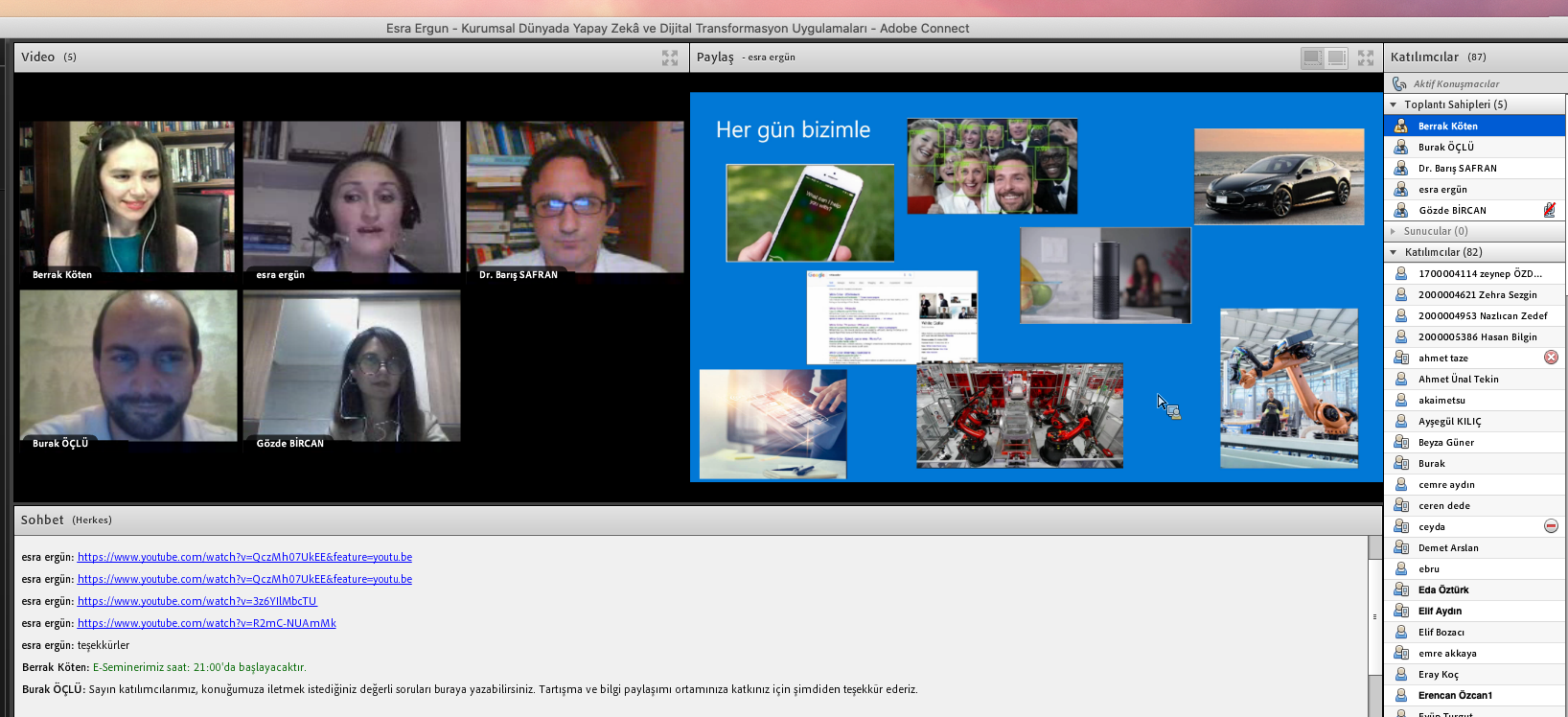 Öğr. Gör. Berrak Köten, Öğr. Gör. Dr. Barış Safran, Öğr. Gör. Burak Öçlü ve Öğr. Gör. Gözde Bircan ile ve tüm katılımcıların sorularını yanıtlayan Esra Ergün yapay zekâ uygulamalarının yaygınlaşmasıyla çok çeşitli disiplinleri içinde barındırdığını belirterek uzmanlık ve ilgi alanları doğrultusunda odaklanılması gerektiğinin altını çizdi. Öğrencilerimize, bu alandaki sektörel yayınları, işletmecilik dergilerini ve webinarları takip etmelerini önerdi.