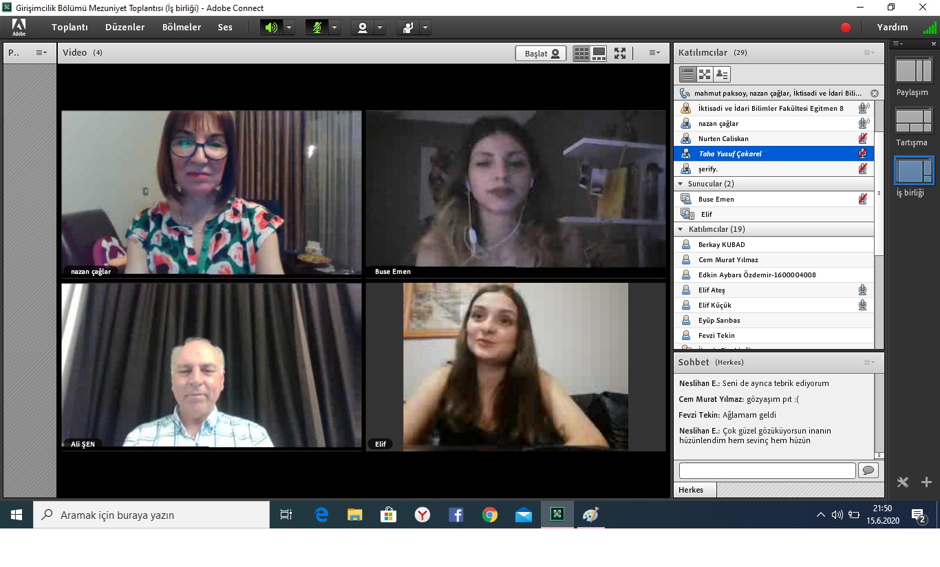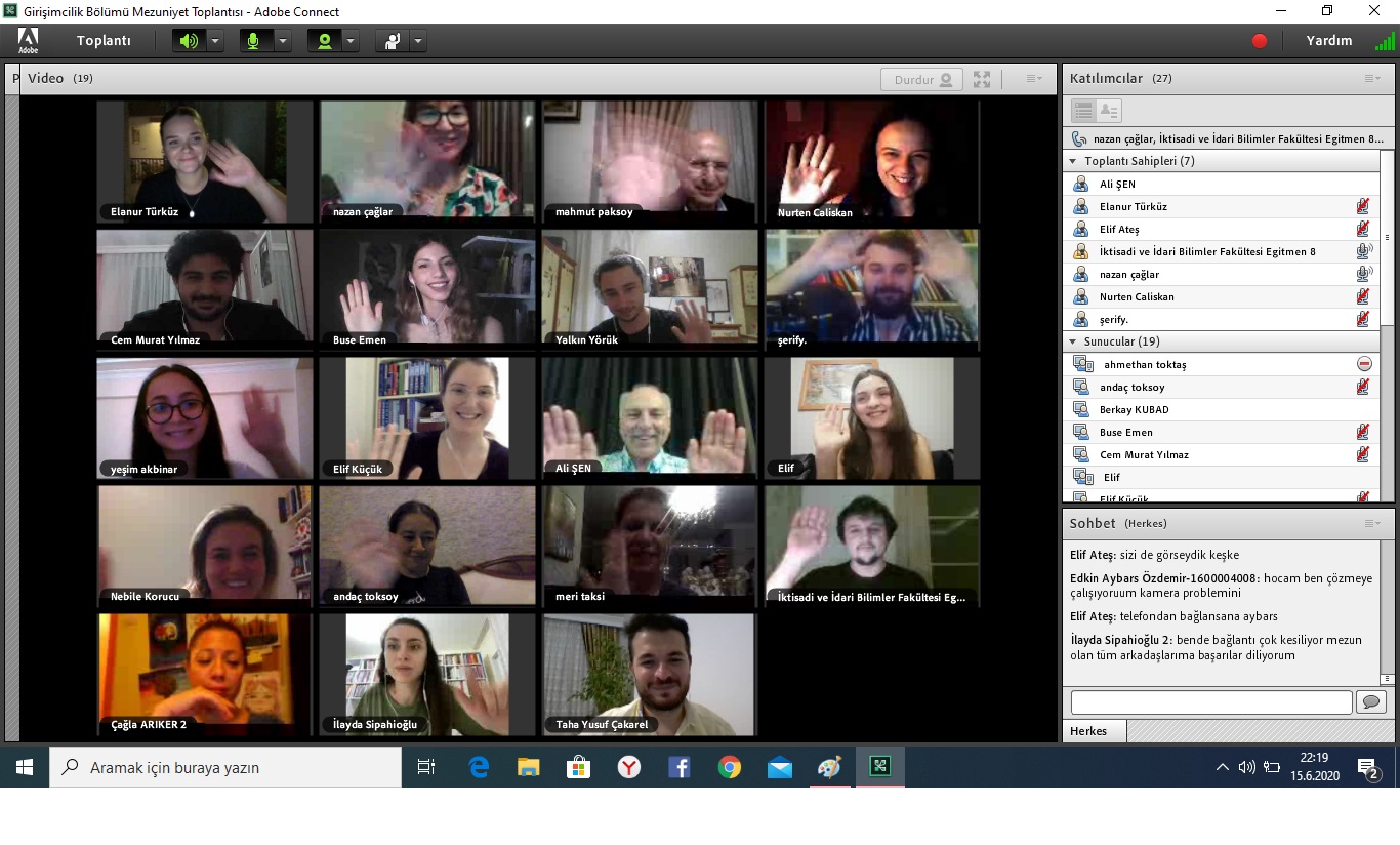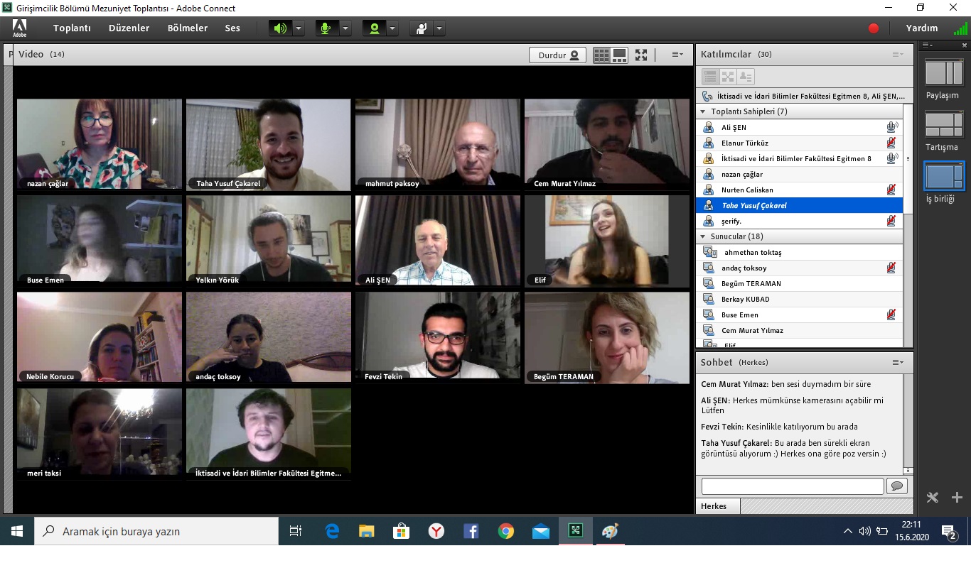 İstanbul Kültür Üniversitesi İktisadi ve İdari Bilimler Fakültesi Girişimcilik Bölümü, mezun durumundaki öğrencilerin, akademik personelin ve öğrenci ailelerinin de katılımıyla 15 Haziran Pazartesi günü saat 21.00’de Adobe Connect Sanal Sınıf Uygulaması üzerinden bir toplantı gerçekleştirdi.