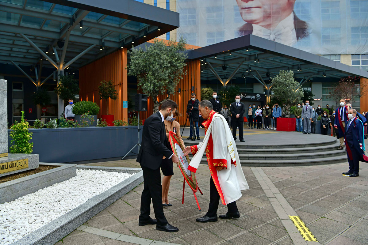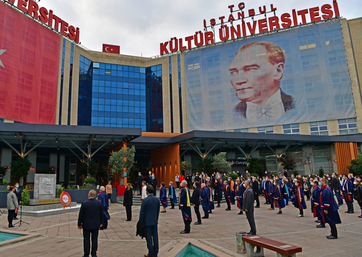 İstanbul Kültür Üniversitesi (İKÜ), 10 Kasım Atatürk’ü Anma Günü dolayısıyla tören düzenledi. Yeni Koronavirüs Pandemisi (COVID-19) nedeniyle sosyal mesafe kuralları gözetilerek Ataköy yerleşkesinde gerçekleştirilen törene, Mütevelli Heyet Başkanımız Dr. Bahar Akıngüç Günver, Rektörümüz Prof. Dr. Erhan Güzel, Rektör Yardımcımız Prof. Dr. Nihal Sarıer, akademik ve idari personel katıldı. Ulu Önder Mustafa Kemal Atatürk’ün ebediyete intikalinin 82. yılında yapılan anma programı, 10 Kasım Salı günü saat 09.05’te Ataköy yerleşkesi ön bahçedeki Atatürk büstüne çelenk takdimi, saygı duruşu ve İstiklal Marşı’nın okunması ile başladı.