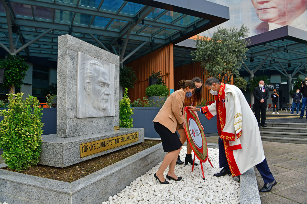 Yeni Koronavirüs Pandemisi (Covid-19) nedeniyle sosyal mesafe kuralları gözetilerek 28 Ekim Çarşamba günü saat 10.15’te Ataköy yerleşkesi ön bahçede İstiklal Marşı’nın okunması ve Atatürk Anıtı’na çelenk takdimi ile başladı.