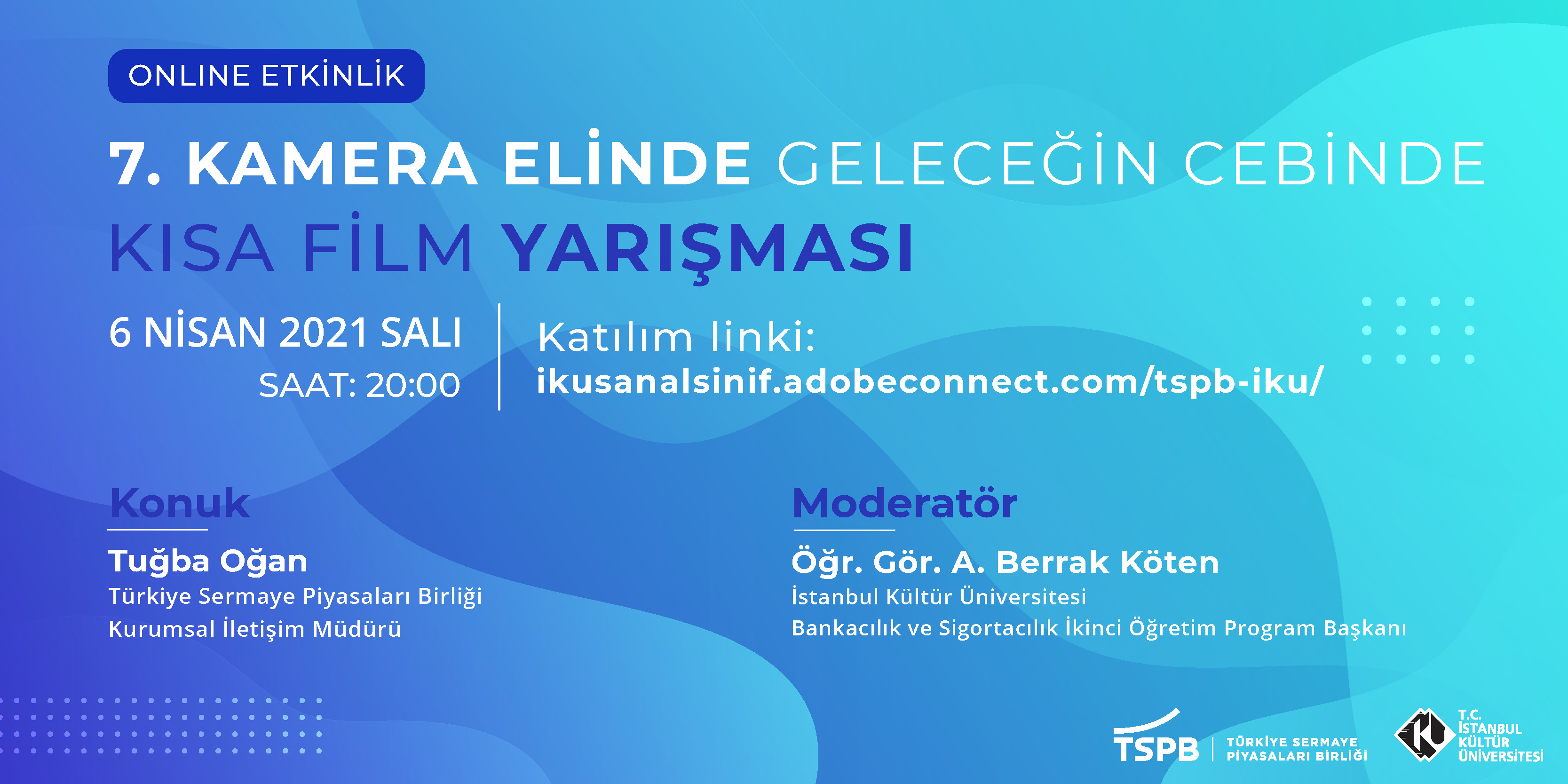 Türkiye Sermaye Piyasaları Birliği “TSPB” tarafından düzenlenen “Kamera Elinde Geleceğin Cebinde” kısa film yarışmasına katılmak isteyen öğrencilerimizi ve akademisyenlerimizi bilgilendirmek amacıyla 6 Nisan 2021 Salı günü saat 20.00’de toplantı gerçekleştirilecek. Bankacılık ve Sigortacılık İkinci Öğretim Program Başkanı Öğr. Gör. A. Berrak Köten’in moderatörlüğündeki etkinliğe konuk olacak TSPB Kurumsal İletişim Müdürü Tuğba Oğan, yarışmaya katılmak isteyen öğrencilerimizin ve akademisyenlerimizin sorularını cevaplandıracak.