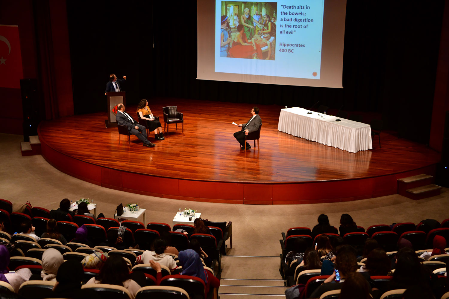 Sempozyumda konuşan Beslenme ve Diyetetik Bölüm Başkanımız Prof. Dr. Gürhan Raif Çiftçioğlu, dünyayı kasıp kavuran koronavirüs salgınına yakalanmamak için bağışıklık sisteminin güçlü tutulması gerektiğini belirtti. Probiyotik yönünden zengin beslenilmesi uyarısında bulunan hocamız, “Haftada bir ya da belli periyotlar halinde kefir, her gün 1 kâse yoğurt tüketmenizde fayda var. Bağışıklığınızı güçlendirmek için turşu ve bunun yanında fermente et ürünleri de tüketebilirsiniz” dedi.