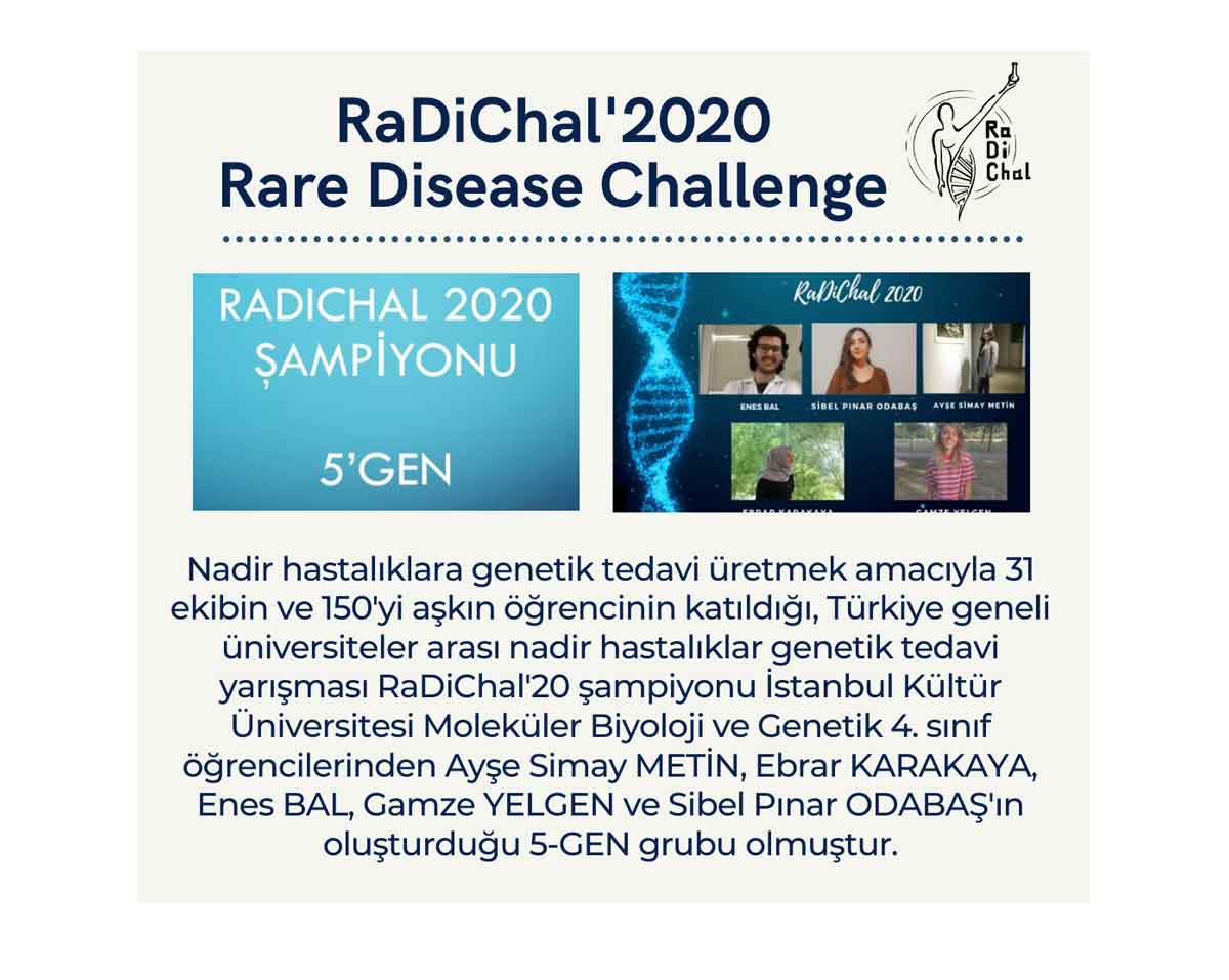 Kurucu direktörlüğünü Dr. Cihan TAŞTAN’ın yaptığı, nadir hastalıklara genetik tedavi üretmek amacıyla proje geliştirmek için 31 ekibin ve 150’yi aşkın öğrencinin katıldığı, Türkiye geneli üniversiteler arası nadir hastalıklar genetik tedavi yarışması RaDiChal’20 ‘nin şampiyonu ‘’Prime Editing ile c.840 C>T Transisyonunun Düzeltilmesi ve c.859 G>C Dönüşümünün Sağlanmasıyla SMN2 Gen Etkinliğinin ve SMN Protein Anlatımının Arttırılması’’ adlı projeleri ile İstanbul Kültür Üniversitesi Moleküler Biyoloji ve Genetik Bölümü 4. Sınıf öğrencileri Ayşe Simay METİN, Ebrar KARAKAYA, Enes BAL, Gamze YELGEN ve Sibel Pınar ODABAŞ’ın oluşturduğu 5-GEN takımı olmuştur.