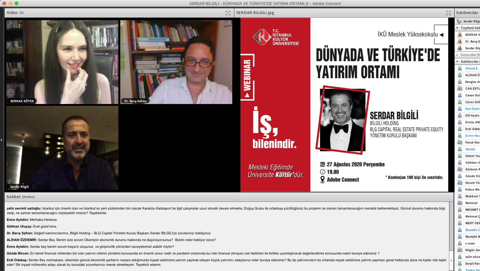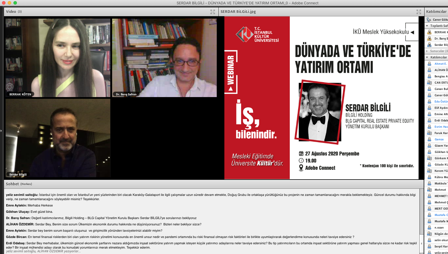 İstanbul Kültür Üniversitesi (İKÜ) Meslek Yüksekokulu tarafından organize edilen “İş, Bilenindir: Girişimcilik Modelleri” webinar serisi kapsamında, 27 Ağustos Perşembe günü “Dünyada ve Türkiye’de Yatırım Ortamı” başlıklı bir söyleşi düzenlendi. Etkinliğe konuşmacı olarak Bilgili Holding ve BLG Capital Real Estate Private Equity Yönetim Kurulu Başkanı Serdar Bilgili katıldı.