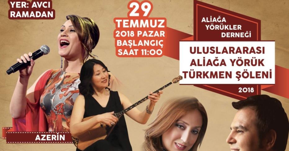 Aliağa Yörükler Derneği tarafından 29 Temmuz Pazar günü Avcı Ramadan Çocuk Oyun ve Rekreasyon Alanı’nda düzenlenecek olan Uluslararası "Aliağa Yörük Türkmen Şöleni"nde, Yörük kültürüne ait birbirinden farklı etkinlikler gerçekleştirilecek. Gün boyu sürecek olan şölen saat 11.00’de Demokrasi Meydanı’ndan etkinlik alanına yapılacak olan temsili göç yürüyüşü ile başlayacak. Şölende sahne alacak olan Azerin, Ali Çakar, Fatoş Kadıoğlu ve Dombıra sanatçısı Şemsigül Jakupova Türkmen Yörük ezgileriyle kulakların pasını silecek.